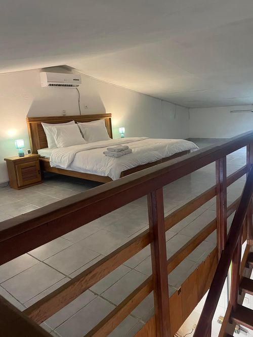 Intimate and atypical, the jungle studio is a tribute to the tropical jungle of our beautiful country Gabon. You will have the impression of being lost on an island with the beach and right next to a lush forest. It has a living room with a sofa bed that can accommodate two additional people, an open kitchen, a bedroom, a bathroom, a guest toilet, a very large terrace with a 2-seater swing. and a view of the beach and its coconut trees.